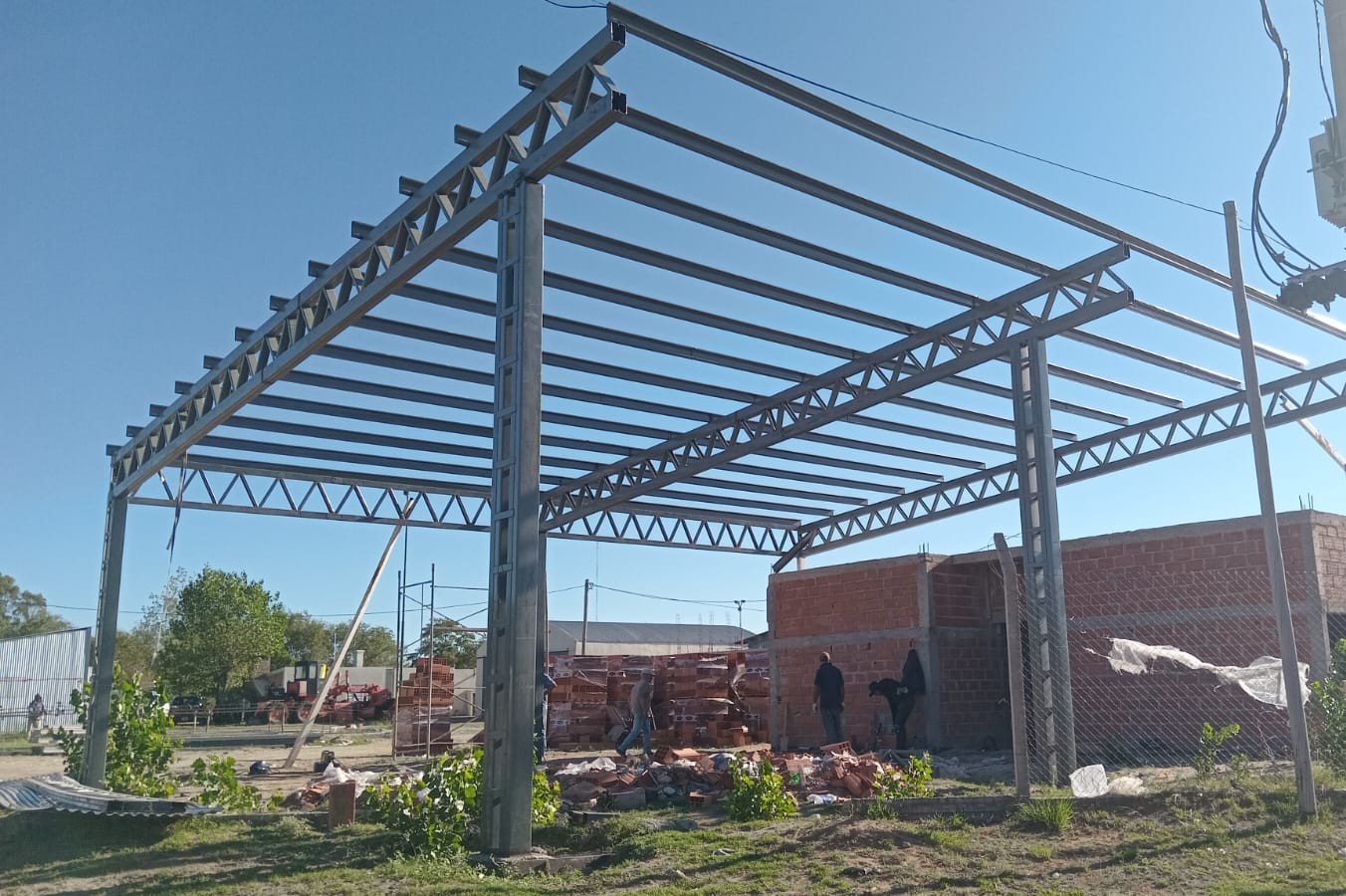 En lo que respecta a herrería, se inició el armado de la estructura del techo del estacionamiento destinado a ambulancias. Asimismo, se realizan labores complementarias vinculadas a la organización del predio y a la continuidad de los frentes de trabajo, consolidando la estructura general del edificio y preparando las superficies para las próximas intervenciones.